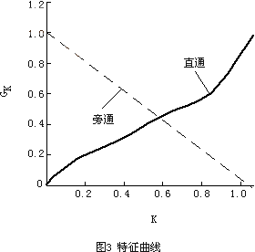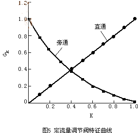 特征曲線包括直通曲線與旁通曲線,要實現定流量,兩條曲線可能有多種組合,但這兩條曲線組合并非是任意的,第一,要符合實際,即在制造工藝上是否可行;第二,要利于將來的調節。為有利于動態調節,將直通曲線設為線性的,旁通曲線由直通的線性決定。即直通曲線為