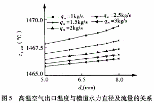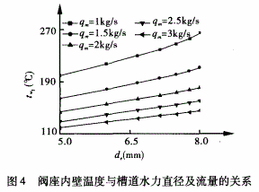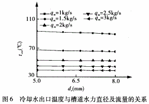 圖4、5分別表示閥座內壁溫度和高溫空氣出口溫度隨槽道水力直徑及冷卻水流量的變化趨勢。