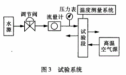 冷卻水由水源流出,經調節閥調至合適流量后,進入到試驗段的閥座矩形槽中,當高溫空氣流經試驗段的閥座中腔通道時,則會與冷卻水進行對流換熱。試驗段裝有溫度測量系統,可對冷卻水和高溫空氣進的出口溫度及閥座壁面溫度進行測量。
