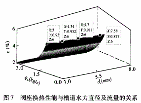 顯然,換熱性能ε與槽道的水力直徑de及冷卻水流量qm密切相關。為保證槽道內冷卻水為單相流,ε的最大值為6%。以de為X軸,qm為Y軸,通過Matlab擬合出關于換熱性能ε的三維曲面,如圖7所示。分析換熱性能時,應控制槽道水力直徑不得低于3mm,以保證能采用常規理論計算,且不得高于8mm,以保證閥座不被高溫氧化。