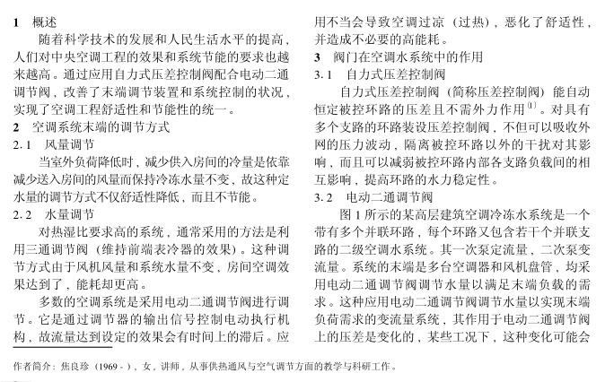 結合中央空調系統的調節特點及電動二通調節閥的工作特性 , 采用自力式壓差控制閥配合電動二通調節閥使用 , 發揮了電動二通調節閥的調節優勢 , 實現空調水系統根據用戶需求變流量 , 從而達到舒適和節能的目的。